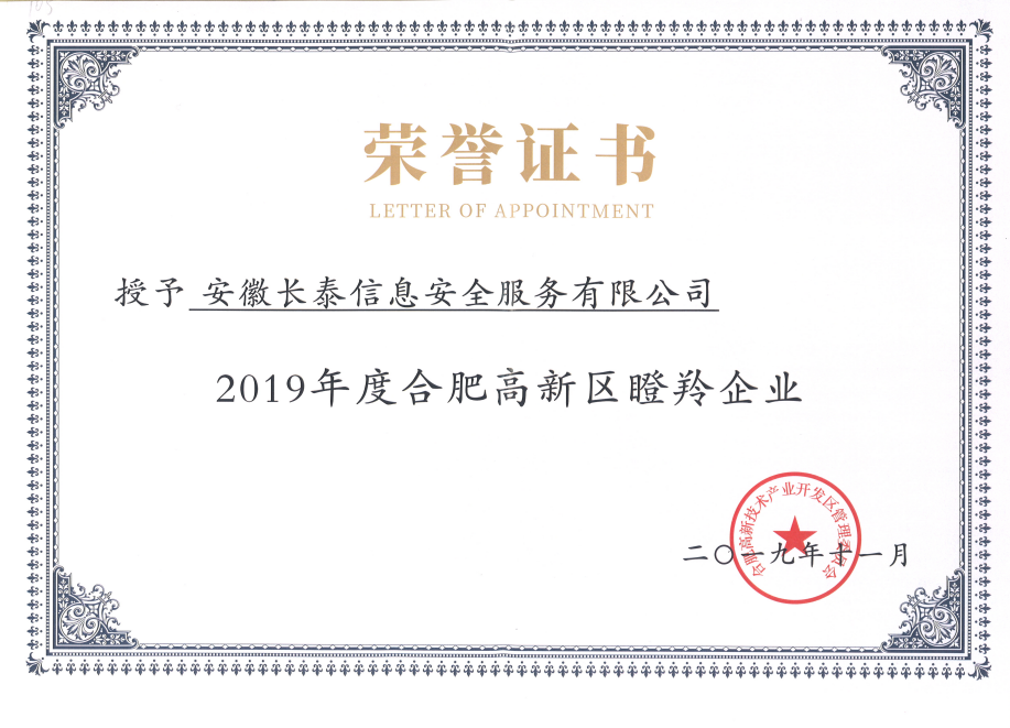 2019年,11月20日,合肥高新区2019年高成长企业榜单正式发布,高新区共认定了502家高成长企业,其中雏鹰企业275家、瞪羚培育企业72家、瞪羚企业149家、潜在独角兽企业3家、独角兽企业1家、平台型龙头企业2家。作为其中的高科技企业——安徽开云线上平台(集团)官方网站成功入选瞪羚企业榜单。